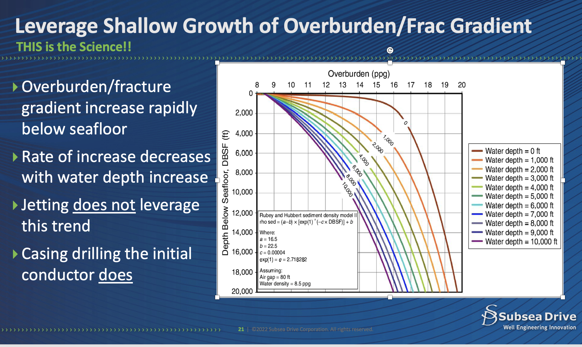 Deepwater Riserless Casing Seat Optimization is the basis for improving deepwater well reliability creating larger hole diameters below the high pressure wellhead conductor (HPWH).